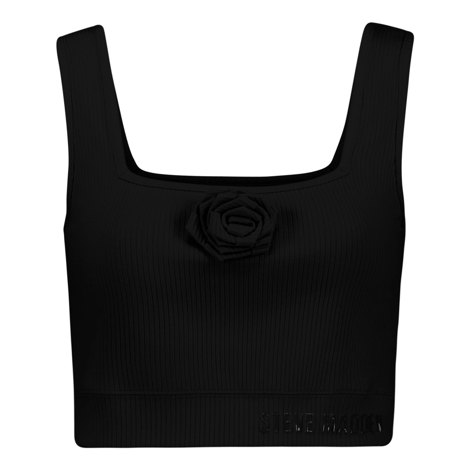 The ARIANNA Cropped Top with Rose in black brings a romantic twist to a modern silhouette. Its delicate rose detail adds a feminine touch to your edgy style.