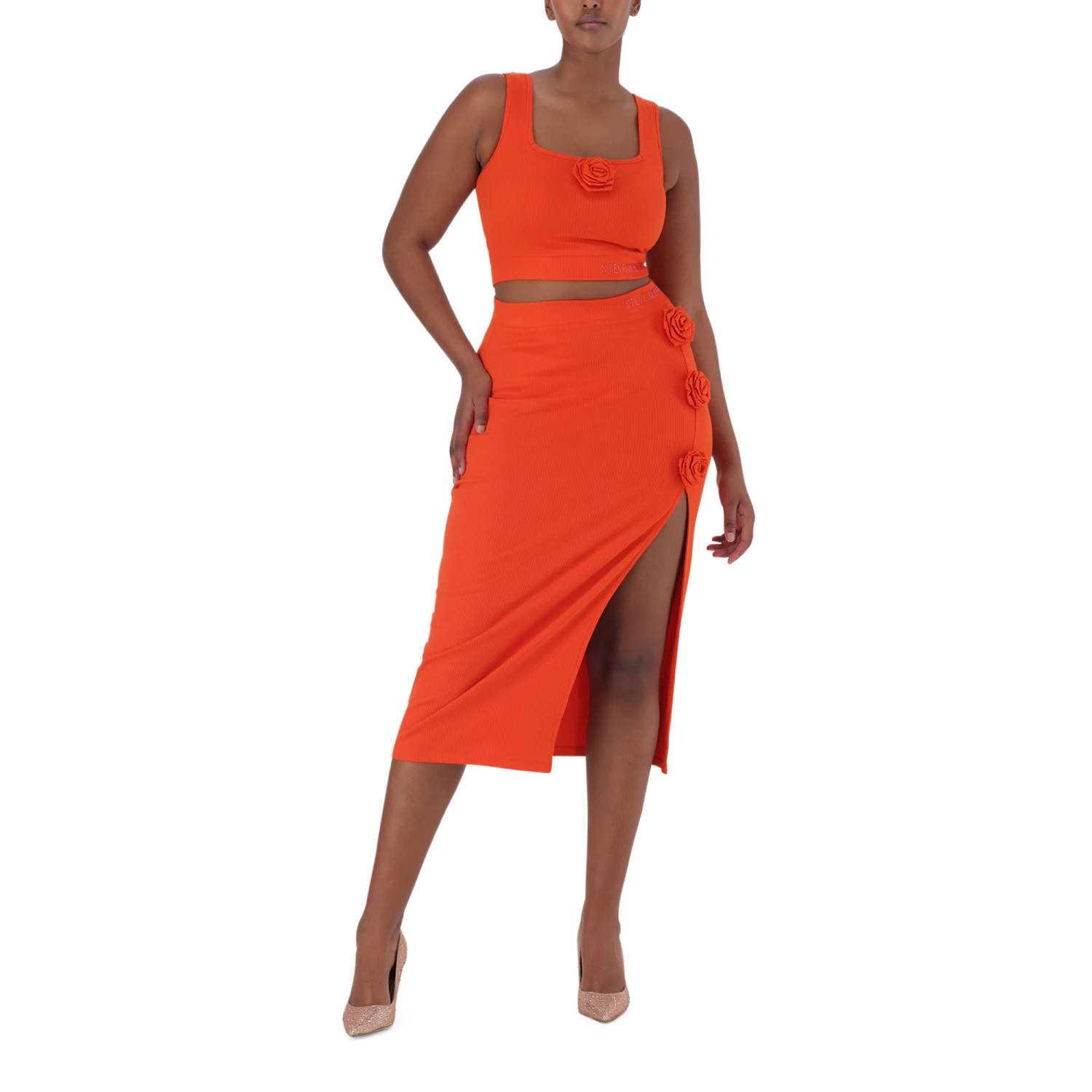The ARIANNA cropped top features a flattering fit with a hint of romantic charm, showcasing an intricate rose that adds a touch of elegance. Paired perfectly with the SADIE bodycon skirt, this set hugs your curves in all the right places, creating a sleek and sophisticated silhouette. Ideal for brunch dates, garden parties, or evening soirées.