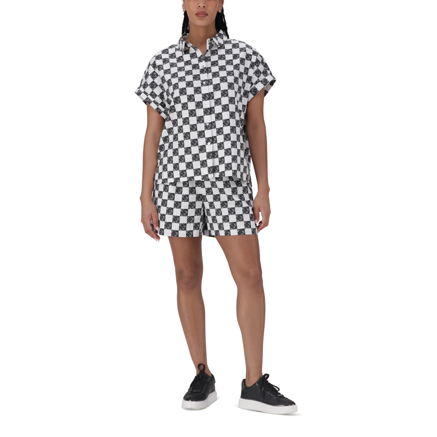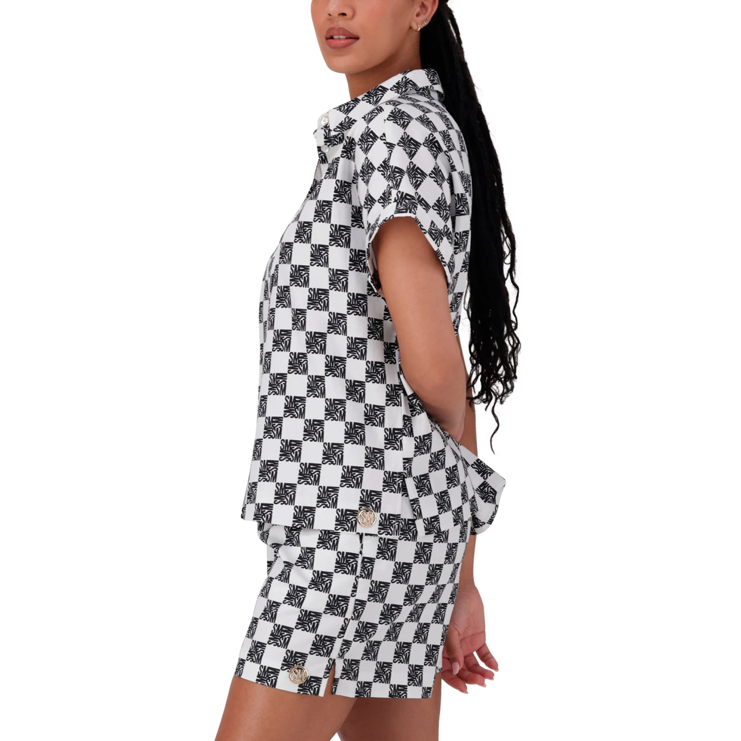 Turn heads this summer with our funky checkered coord set, featuring an all-over logo printed NAVAEH shirt and matching NOVA shorts in a stylish off-white and coffee color palette. This bold, fashion-forward ensemble is perfect for those who love to make a statement. The short-sleeve shirt, adorned with our distinctive logo print, offers a relaxed fit and a trendy vibe, while the coordinating shorts provide ultimate comfort with their adjustable drawstring waistband and practical pockets. Ideal for beach outings, city adventures, or casual hangouts.