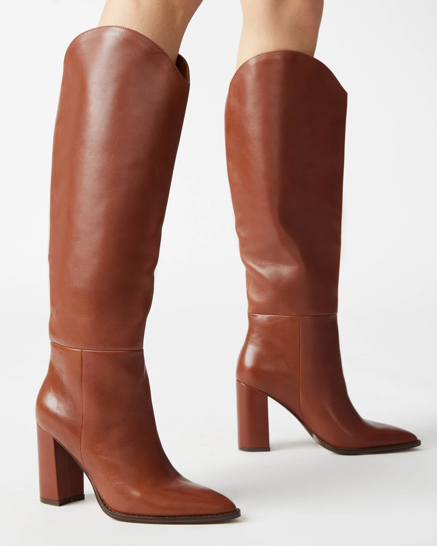 A pointed toe and curved topline give the BIXBY block heel knee boot a Western edge while the sleek upper highlights the clean monochrome look